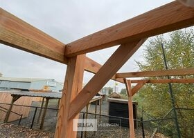 Carport/overkapping 310x600x285cm BxDxHcm Materiaal: . 6 st. Palen 10x10cm douglas Ligger45x145cm Dakbalken45x145cm redwood Carport word geleverd in een bouwpakkeet met hand leiding en bevestigngs materiaal ( paal houders niet in begrepen)
