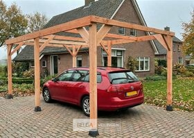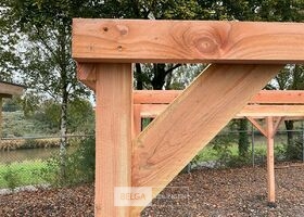 Carport/overkapping 310x1200x285cm BxDxHcm Materiaal: . 10 st. Palen 10x10cm douglas Ligger45x145cm Dakbalken45x145cm redwood Carport word geleverd in een bouwpakkeet met hand leiding en bevestigngs materiaal ( paal houders niet in begrepen)