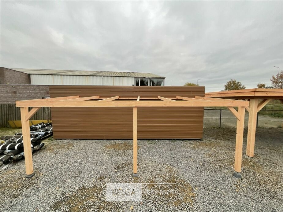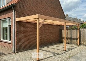 Carport/overkapping 310x300x185/225cm BxDxHcm Materiaal: .2 st. Palen 10x10cm douglas Ligger45x145cm Dakbalken45x145cm redwood Carport word geleverd in een bouwpakkeet met hand leiding en bevestigngs materiaal ( paal houders niet in begrepen)