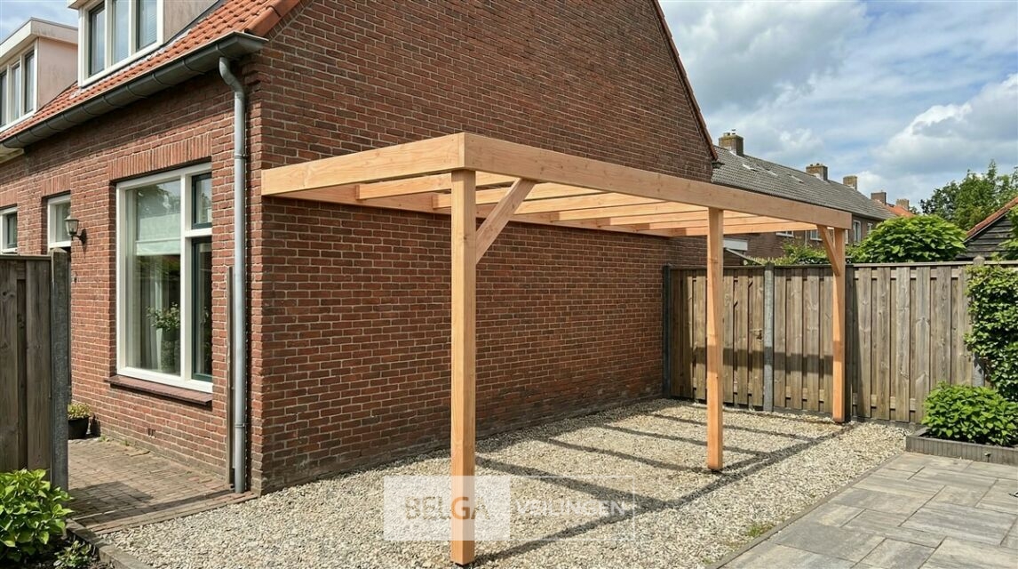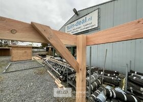 Carport/overkapping 310x1500x185/225cm BxDxHcm Materiaal: .6 st. Palen 10x10cm douglas Ligger45x145cm Dakbalken45x145cm redwood Carport word geleverd in een bouwpakkeet met hand leiding en bevestigngs materiaal ( paal houders niet in begrepen)