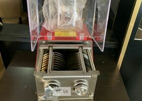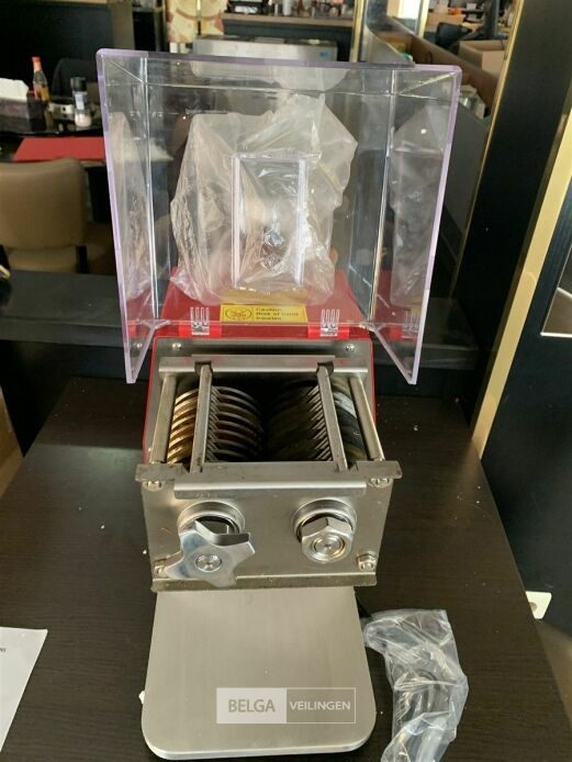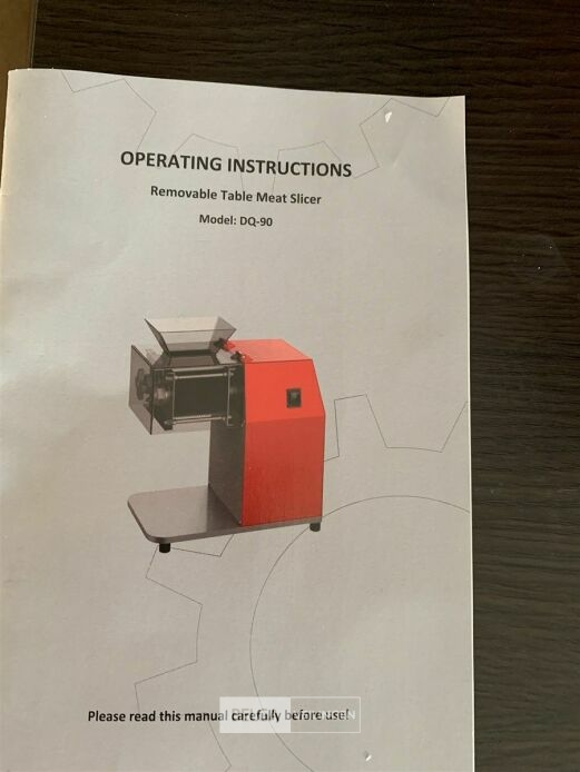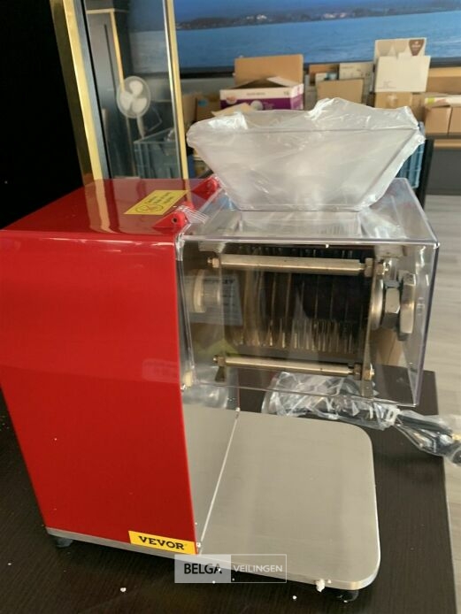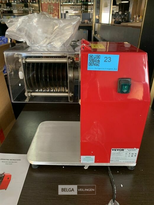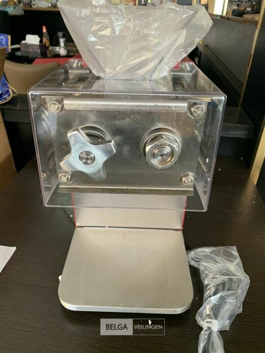 Commerciële vleessnijmachine, model ZTY-HSQR3.5, vermogen 850 W, 220 V. Volledig nieuw apparaat, nooit gebruikt. Evenwel werd het toestel niet getetst op een goede werking. Maak gebruik van het kijkmoment om u te voorzien van de nodige indrukken.’