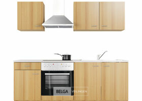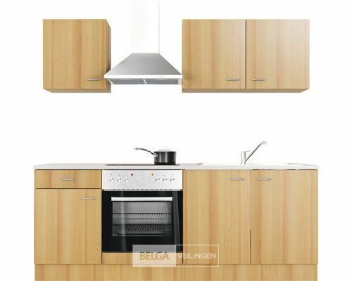 De 210 cm brede keuken bestaat uit: 1 onderkast 50 cm - 1 lade - 1 draaideur - 1 plank 1 ovenombouwkast 60 cm - 1 plint - 1 nis voor inbouwfornuis 1 spoelkast 100 cm - 2 draaideuren 1 bovenkast 50 cm - 1 plank - 1 draaideur - hoogte 54,8cm 1 bovenkast 100cm - 1 plank - 2 draaideuren - hoogte 54,8 cm1 werkblad 210x60 cm