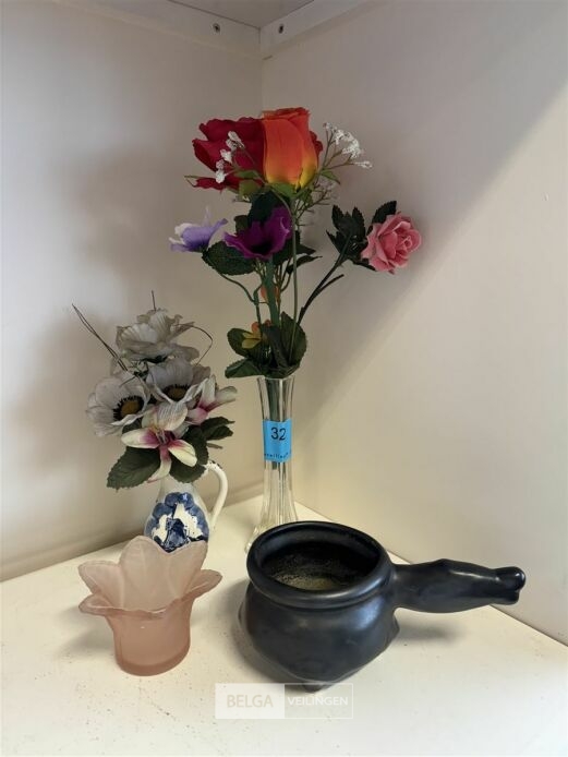 Divers deco o.a. Theelichthouder, vaas met plastieke bloemen, witte vaasje, decoratieve zwarte pot