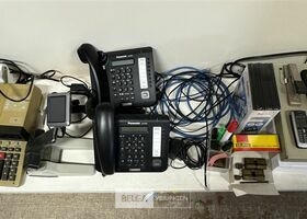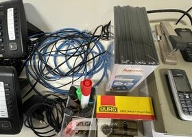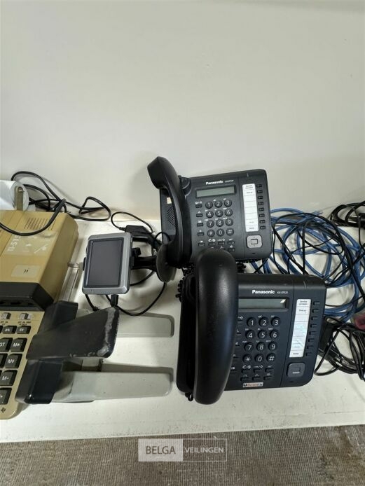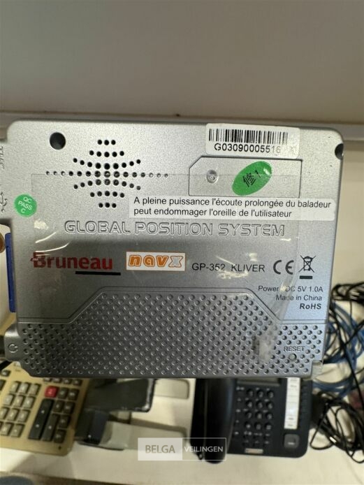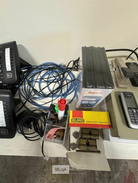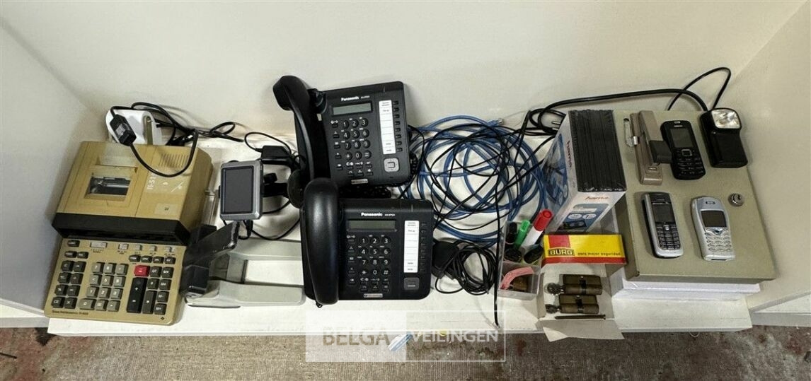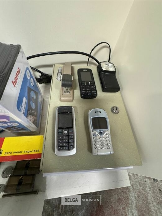 Divers elektro o.a. Elektrisch rekenmachine, GPS, 2 telefoons, 2 sloten, 3 GSM's, nietjesmachine, papier, geldkistje, etc... (elektro : werking : onbekend) – EXCL. Bak