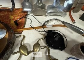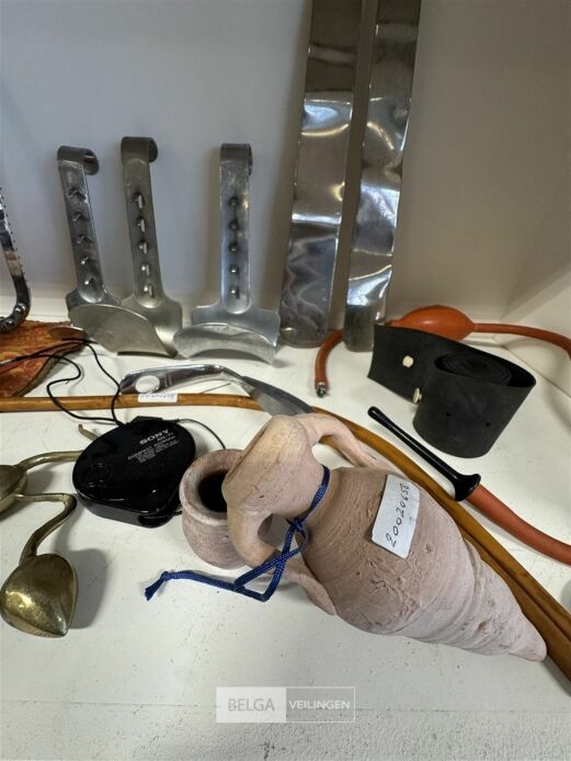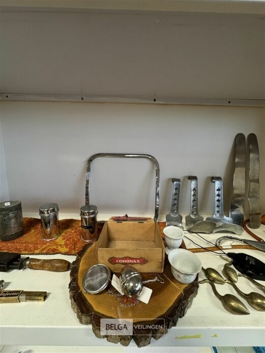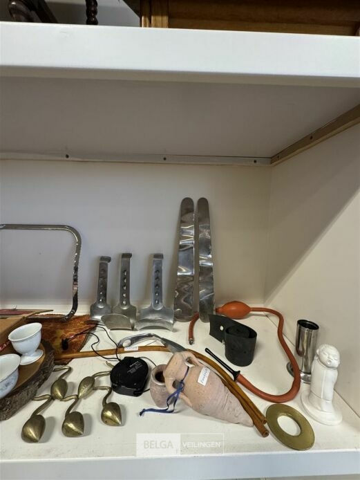 Diverse artikelen o.a.: scheermesje, keukengerief, theekopjes en theefilter, scheplepels, messing haken, etc...