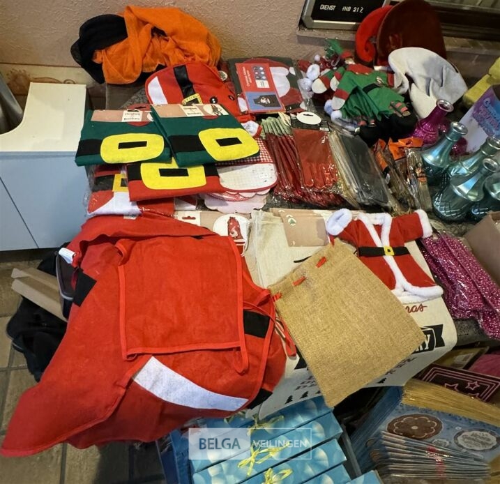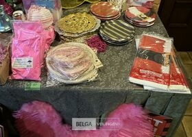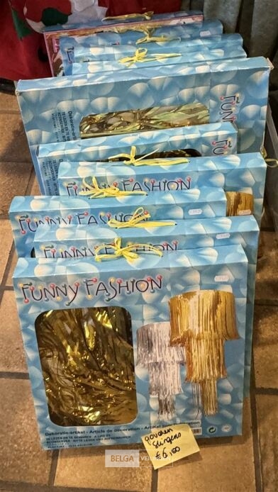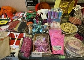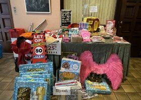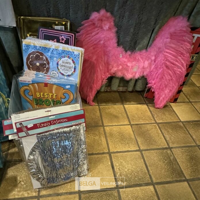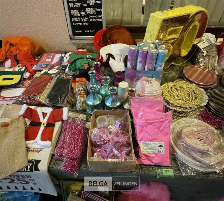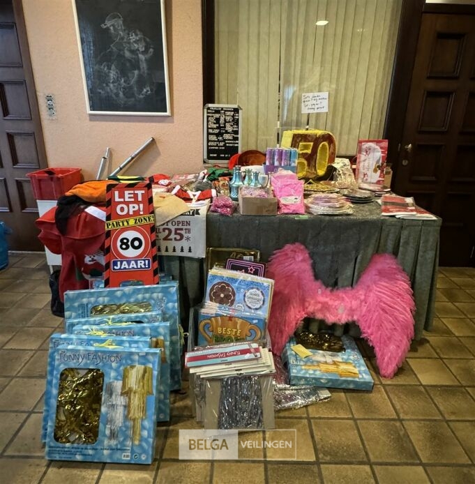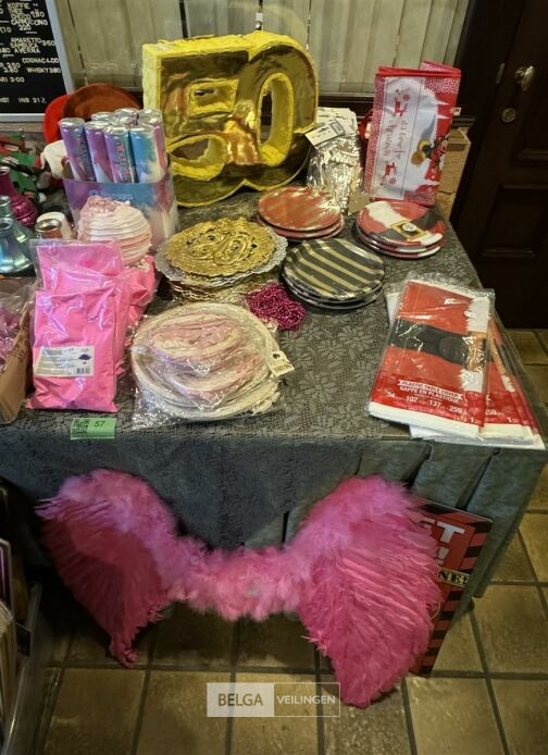 Diverse feestartikelen o.a.: roze vleugels, verkeersbord '80', grote verjaardagskaarten incl plastieke bak, Kerstdecoratie, Kersttafellaken, kartonnen eetbordjes, etc…