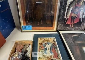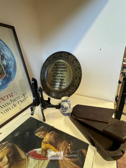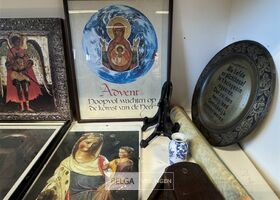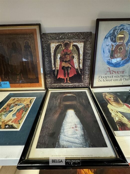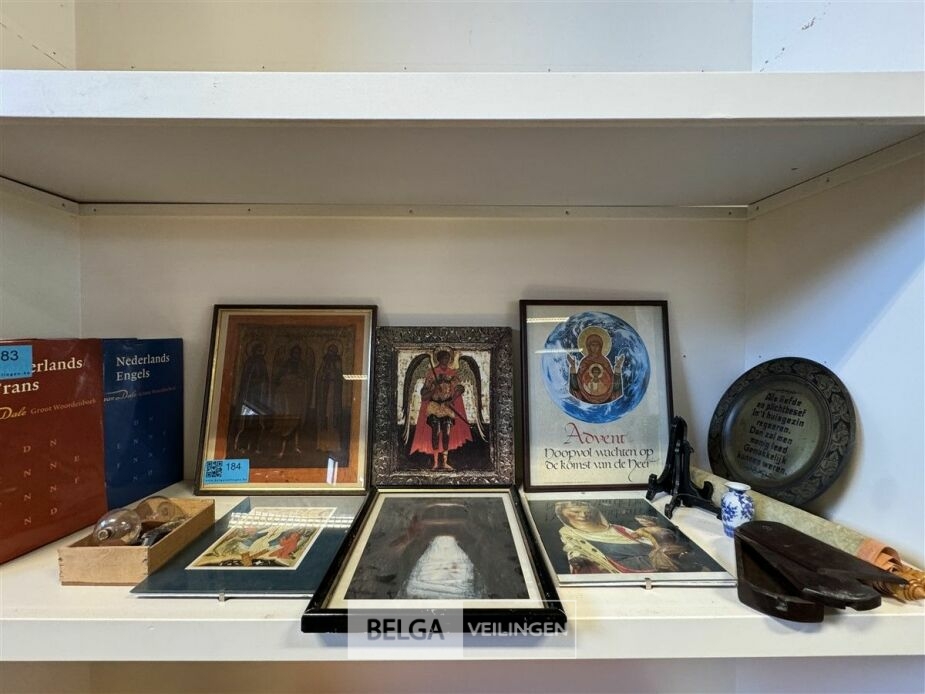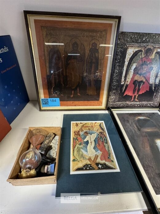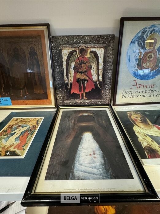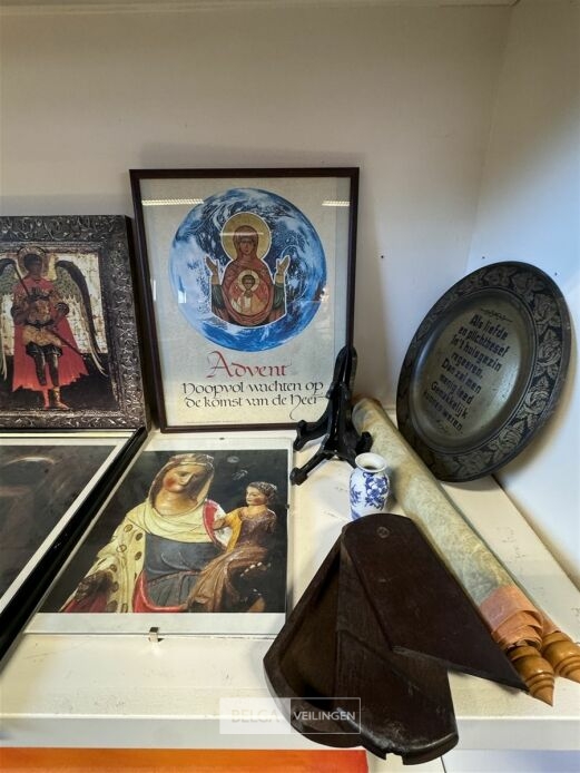 Diverse kaders met kerkelijke afbeeldingen o.a. Doos met zandloper zonder houder, staanders voor borden, schilderij op rol, etc...