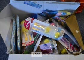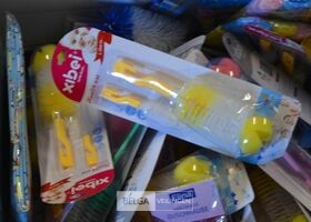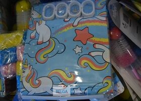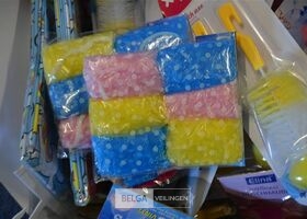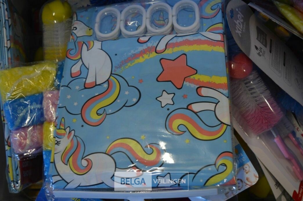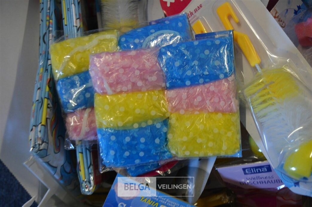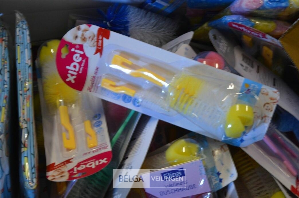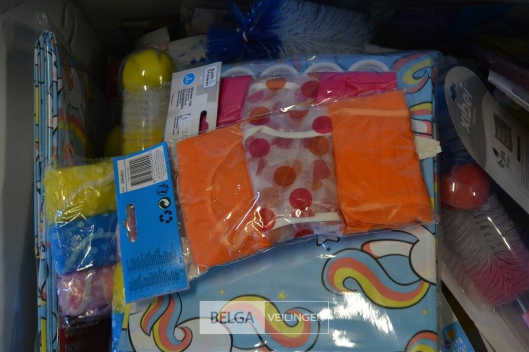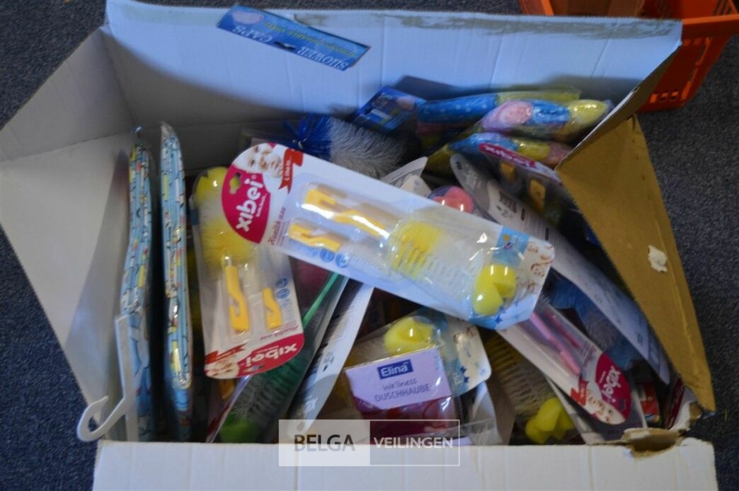 doos div borstels, douchekapjes en gordijnen