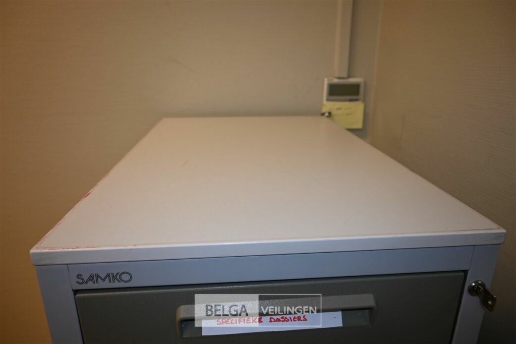 Dossierkast met 4 lades, afm 71x47x138cm. Opgelet! Dit lot bevindt zich op de eerste verdieping en dient door de koper zelf naar beneden te worden gebracht.