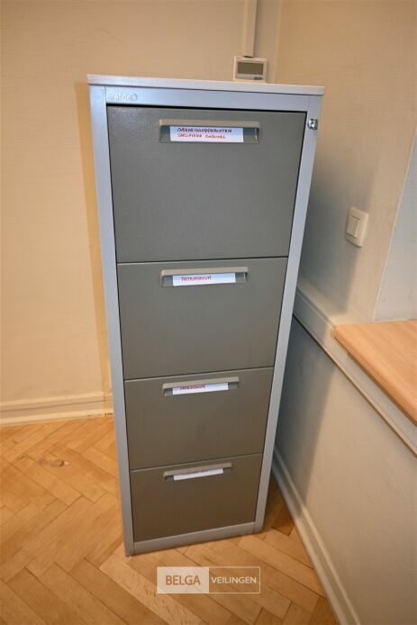 Dossierkast met 4 lades, afm 71x47x138cm. Opgelet! Dit lot bevindt zich op de eerste verdieping en dient door de koper zelf naar beneden te worden gebracht.