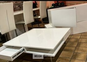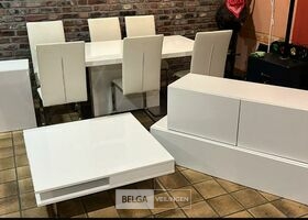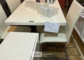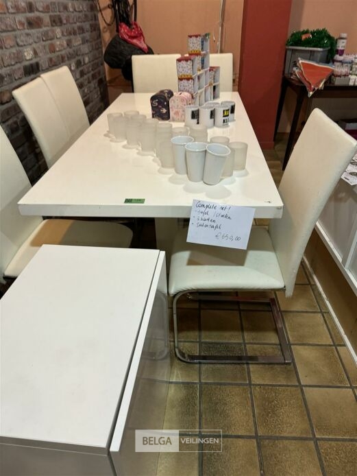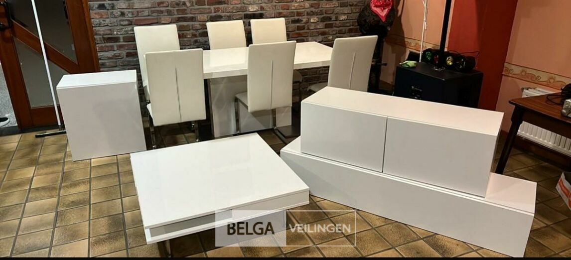 Eetkamerset - Bestaande uit: o.a.: eettafel (180 x 90 x 77 cm), 6 eetkamerstoelen met zithoogte 47 cm, salontafel (95 x 95 x 31 cm), hangtv-meubel (160 x 40 x 30 cm), 2-deurs hangkast (140 x 40 x 40 cm), kast (60 x 40 x 66 cm)