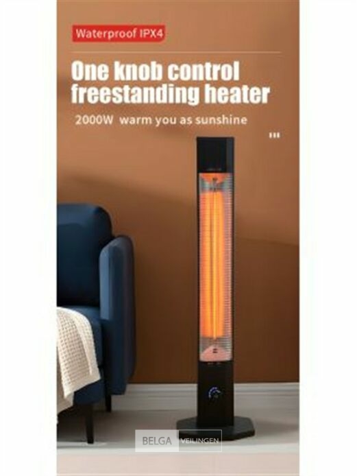 Elektrische Patio heater: afm : 115 cm - Gewicht : 5.6 kg - Verwarmingsvermogen: 2200 W, lichtvermogen - Verwarmingsoppervlak: 20 m² - Verwarmingselement: 1 koolstofvezelbuis - Aluminium steun en reflector - Roestvrijstalen beschermkappen - Staal met gepoedercoat paneel - Gemakkelijk te verplaatsen, met 2 wielen in de voet - 1,8 meter lange kabel