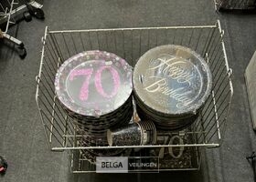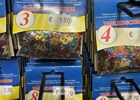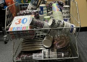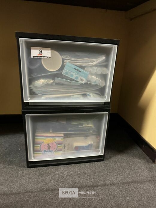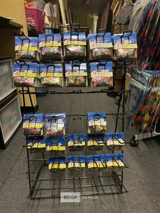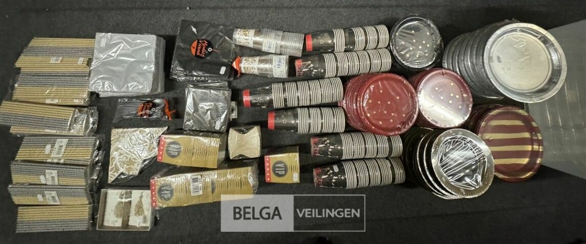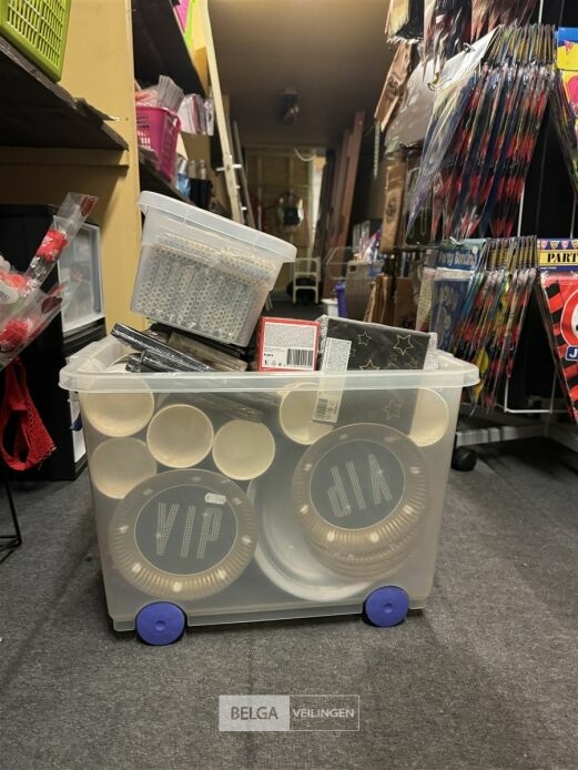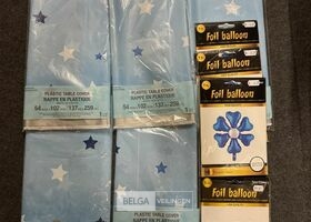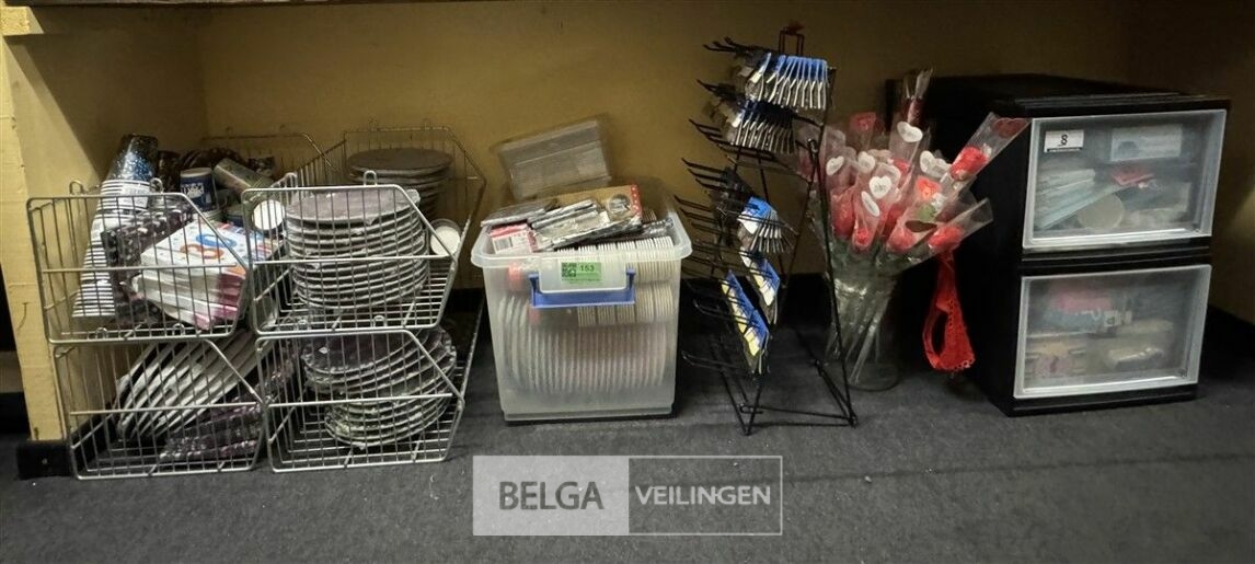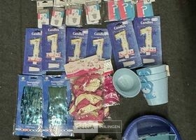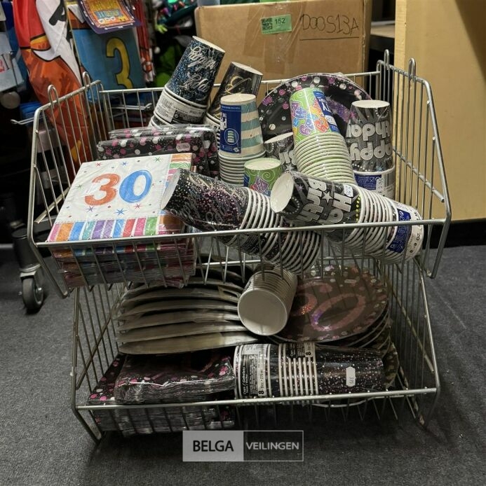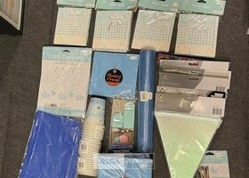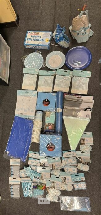 Feestartikelen divers o.a.: borden, bekers, servetten, rietjes, glitter tafeldeco, 'It's a boy decoratie' (volledig schap) ( zonder ijzeren manden organizer bakken)