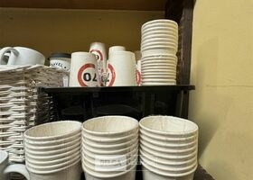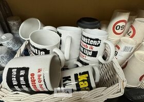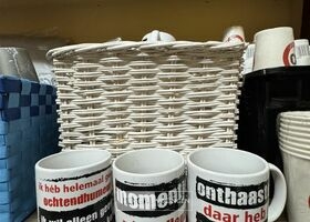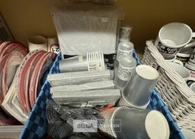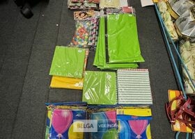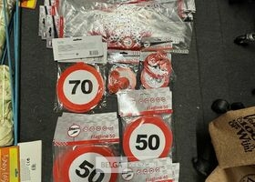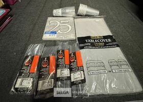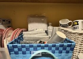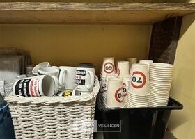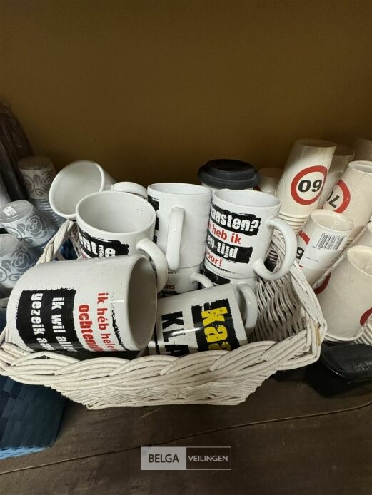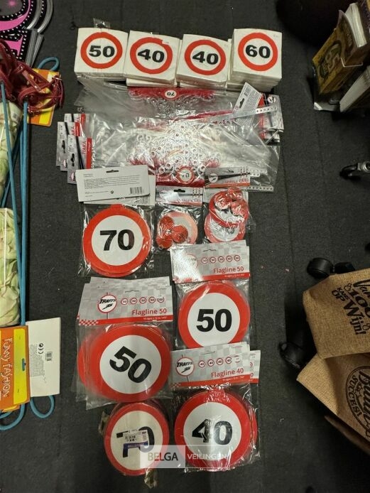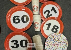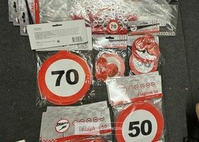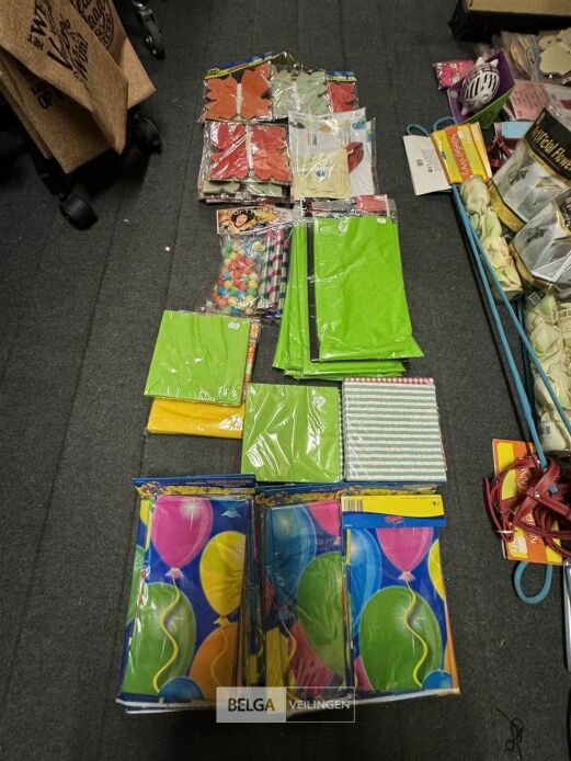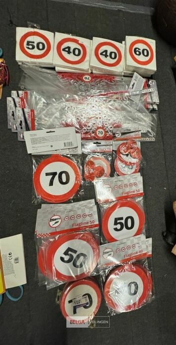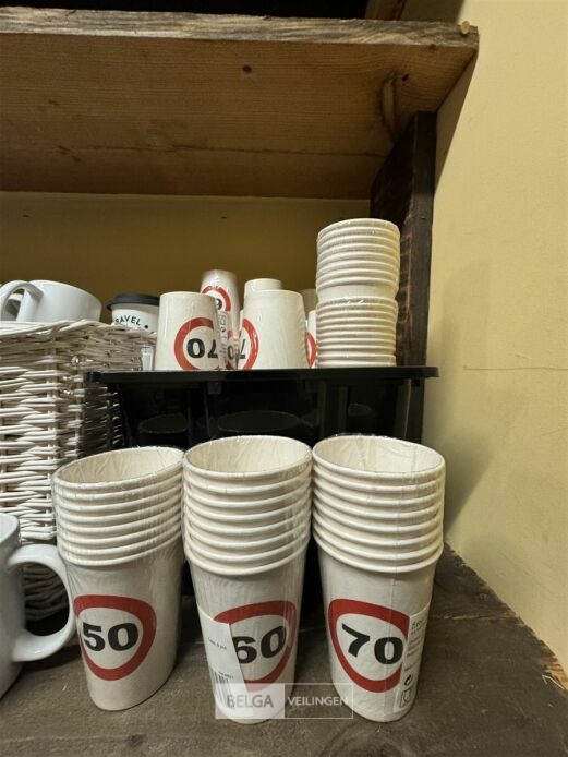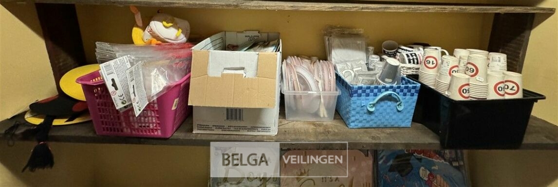 Feestartikelen divers o.a.: bekers met leeftijd, mokken met opschrift, servetten, borden, bestek, party-versiering, diverse hoeden en vlaggen (volledig schap)