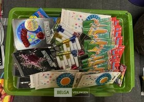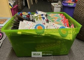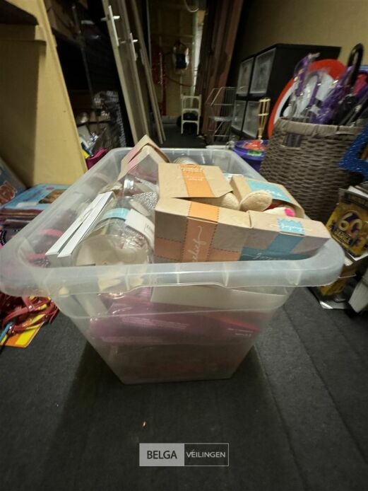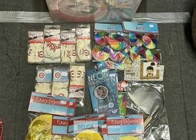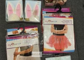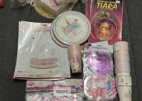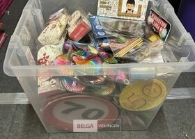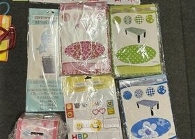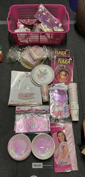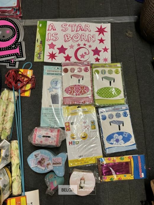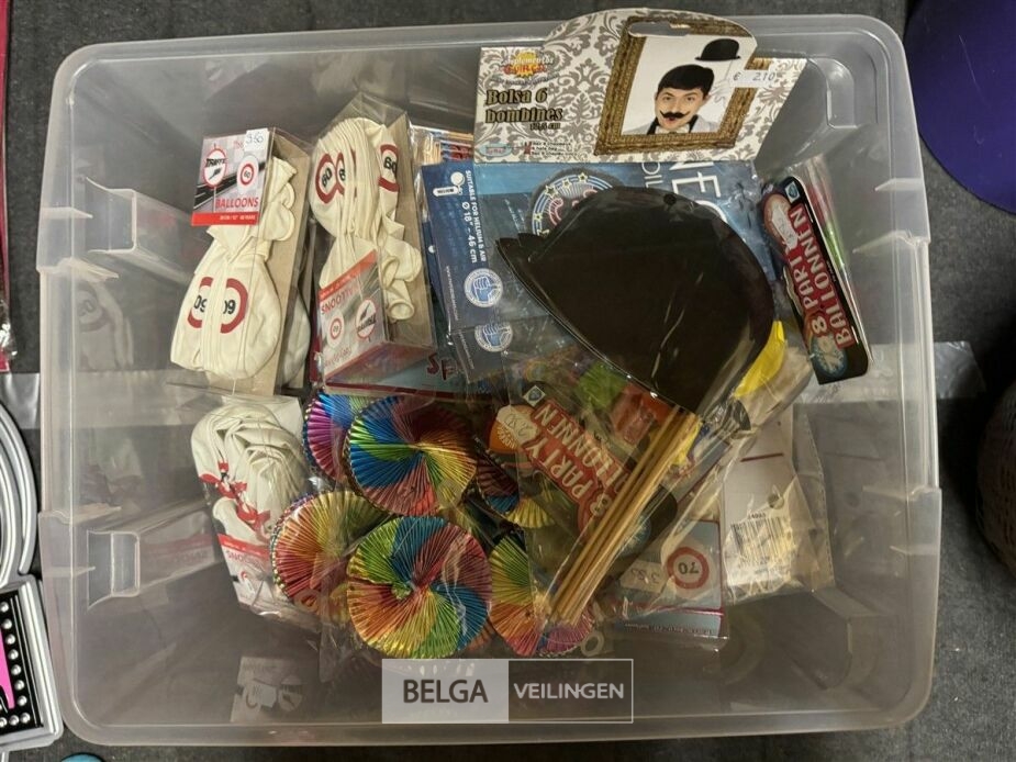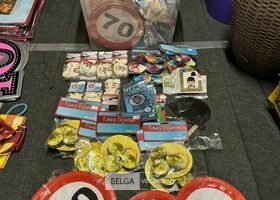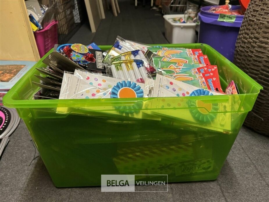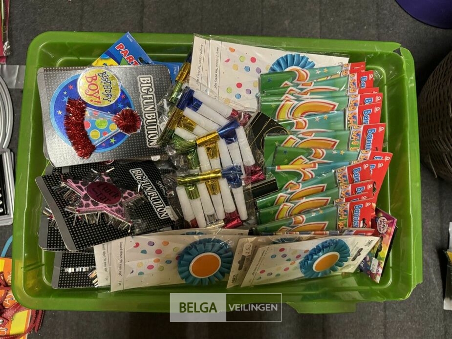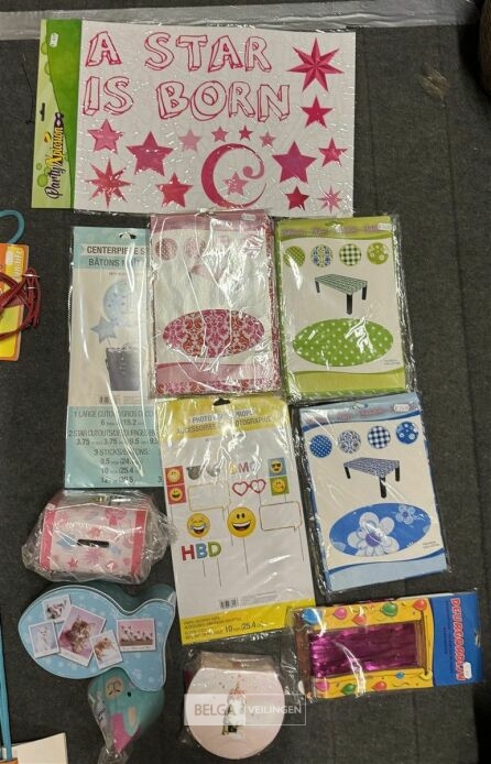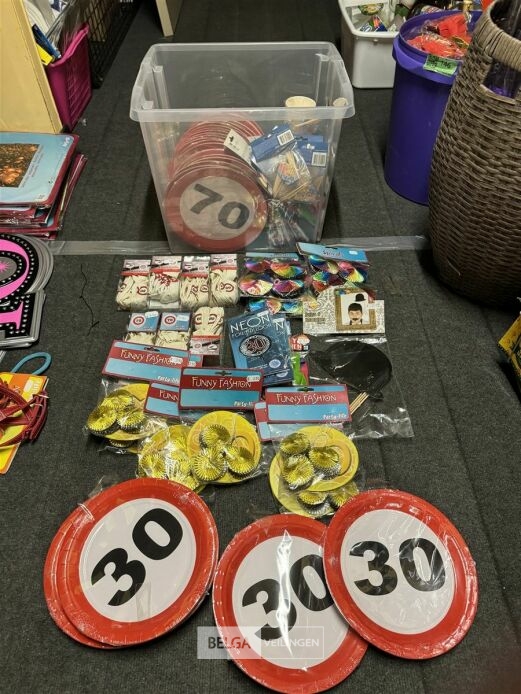 Feestartikelen diverso.a.: photobooth -accessoires, tafellakens, ballonnen met leeftijd, slingers, borden, onderleggers glazen ( volldig schap)