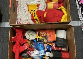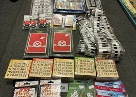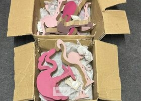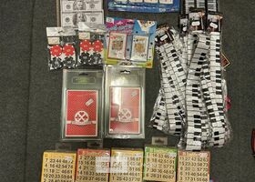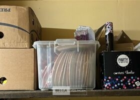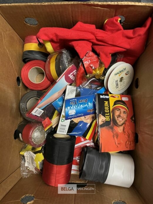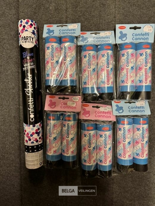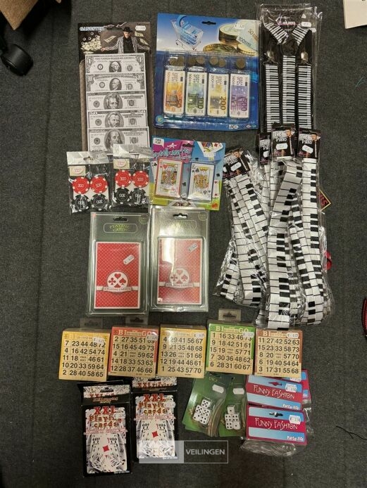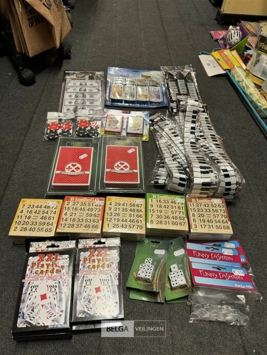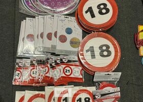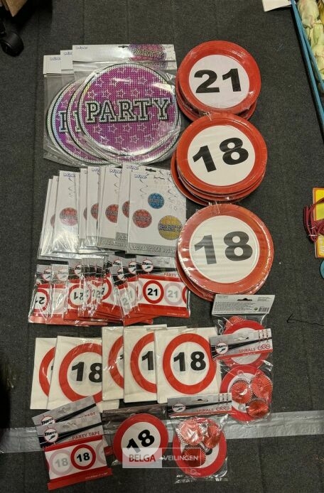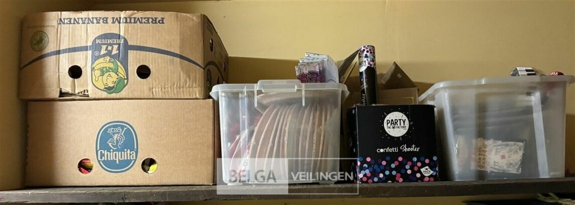 Feestartikelen divers o.a.: thema casino, confetti kanon, tafeldecoratie flamingo, borden, servetten, partyslingers, voetballinten Spanje ( volledig schap)