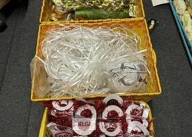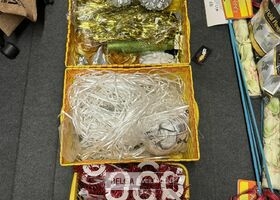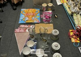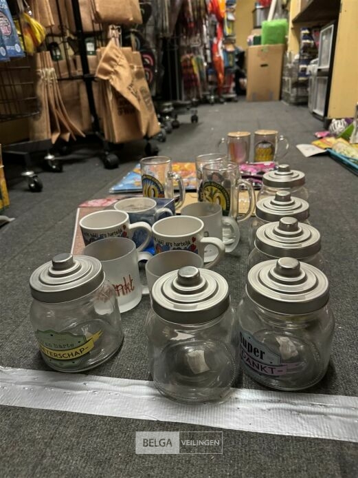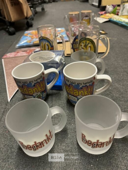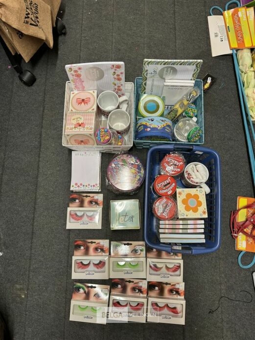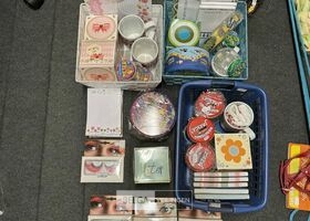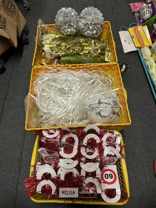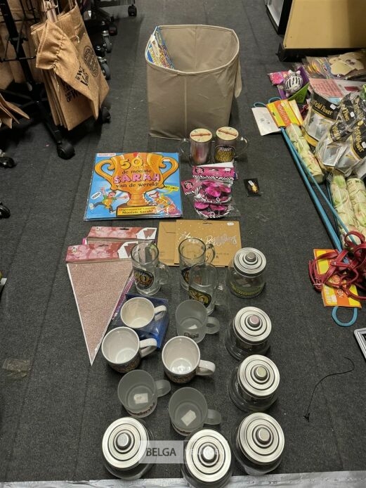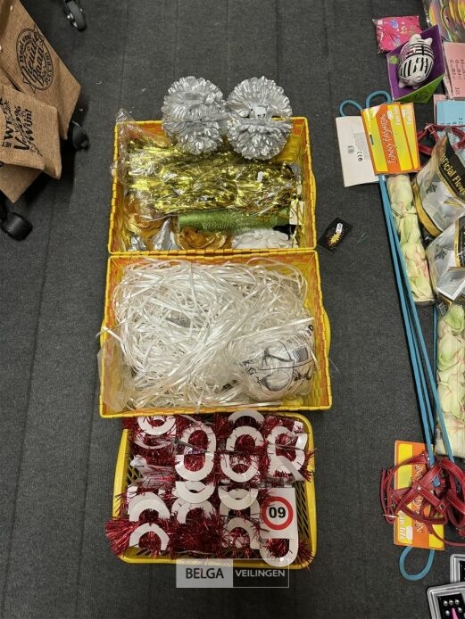 Feestartikelen divers o.a.: slingers, tafelversiering met leeftijd, wimpers, mokken, etc, … ( zonder ijzeren rieten manden)