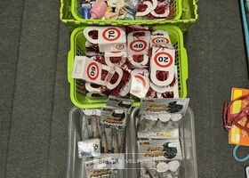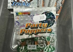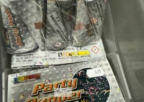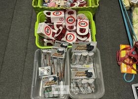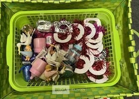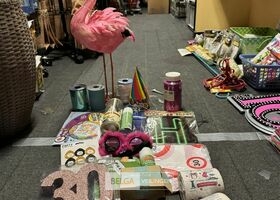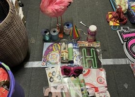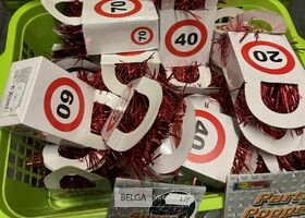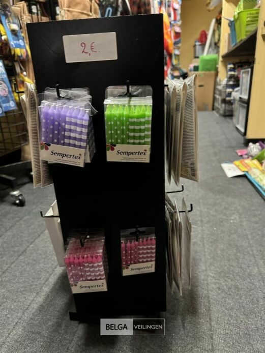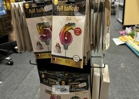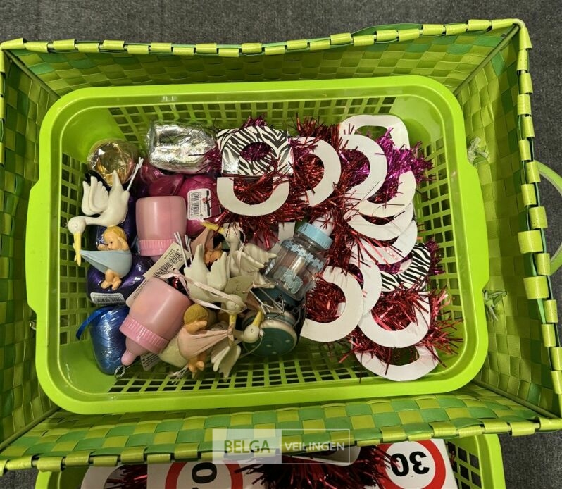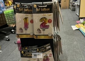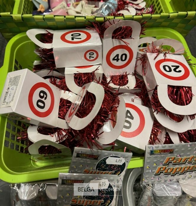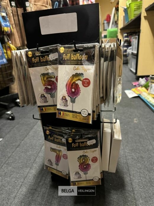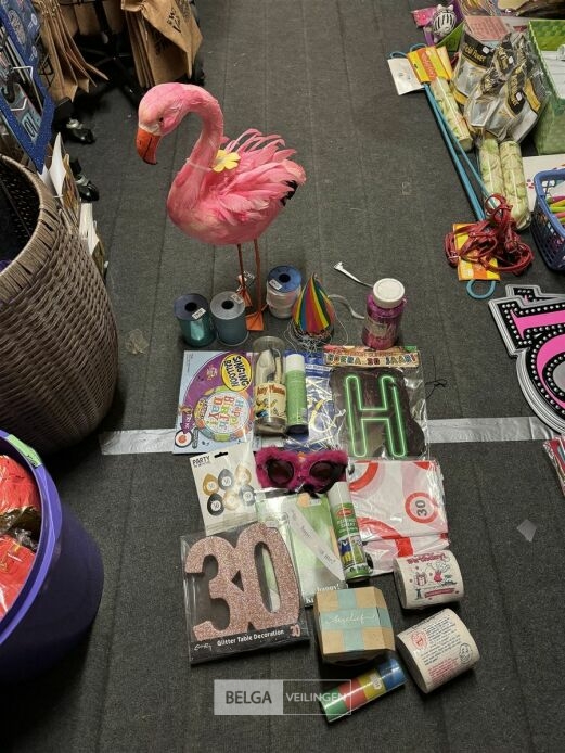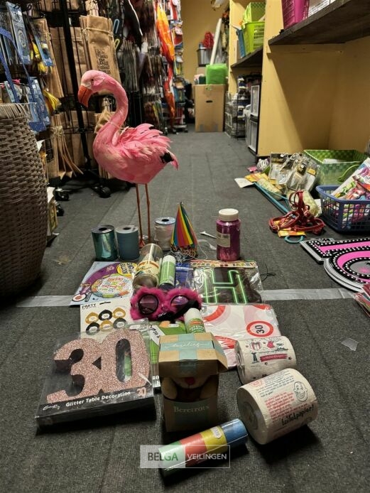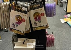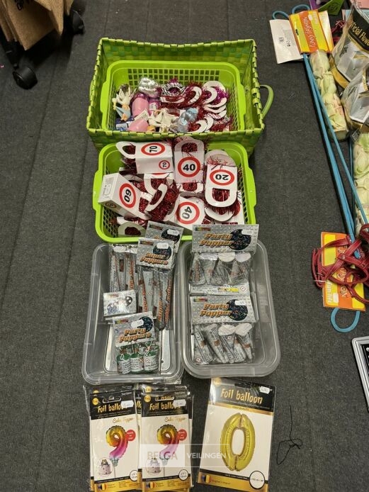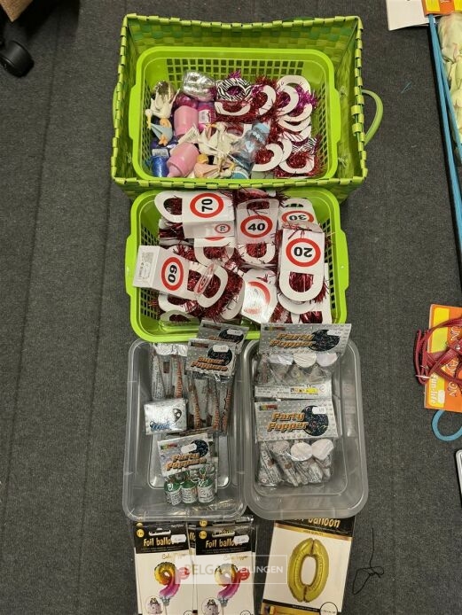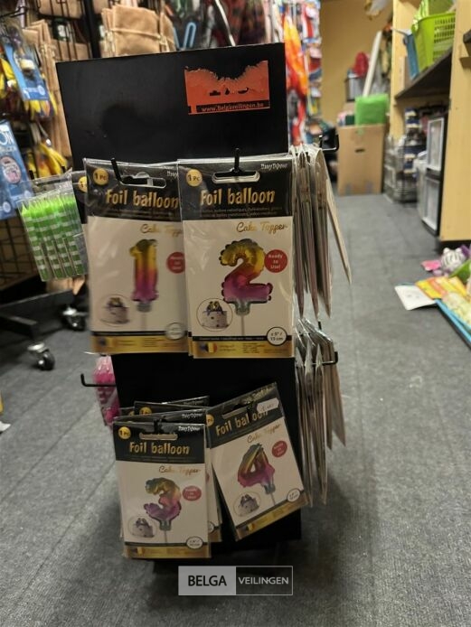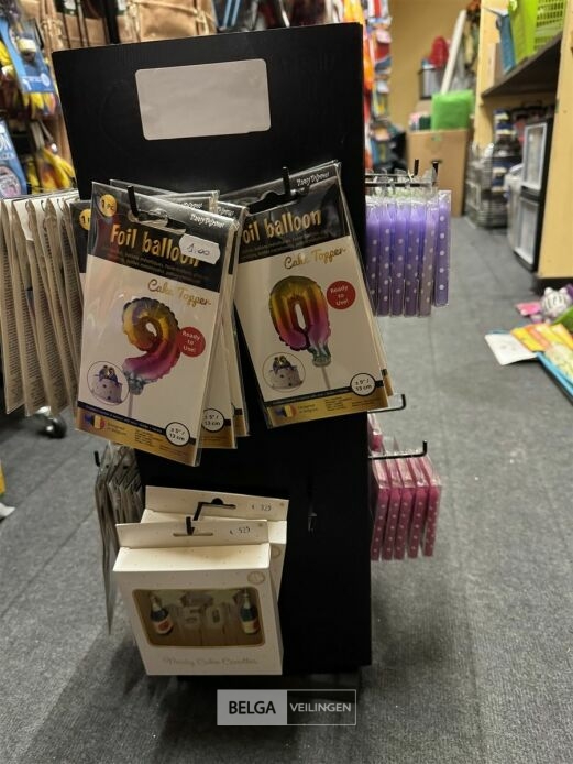 Feestartikelen divers o.a.: rek met folieballonnen, verjaardagskaarsen, flamingo, glitter, verjaardagshoedjes, slingers, tafeldeco cijfer(s), pruikenhouder ( 3 stuks) incl. masker, party poppers (volledig schap)