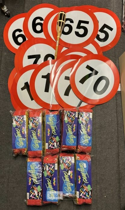 Feestdeco slingers + verjaardagsborden (±15) + tuinfakkel