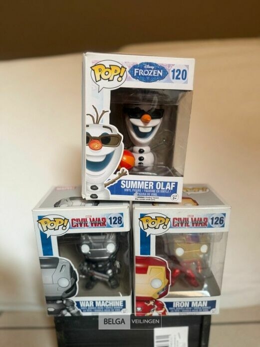 Funko – POP ! Civil War N° 126 Iron Man, Civil War N° 128 War Machine en Frozen N° 120 Summer Olaf