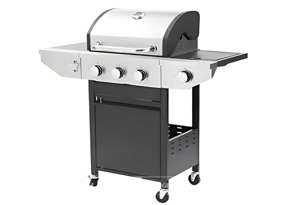 Gasbarbecue: Productafmetingen: 110 x 53 x 110 cm | Kookoppervlak: 515 x 375 mm, geëmailleerde gietijzeren grillroosters, 2 stuks | Warmhoudrek: Roestvrijstalen warmhoudrek | Deksel: #430 roestvrijstalen dekselpaneel, dubbellaags, met zwarte zijpanelen, met roestvrijstalen thermometer |Vuurkast: Staal, met hittebestendige (550 °C) poedercoating | Brander en Power roestvrijstalen buisbranders, 2,8 kW per hoofdbrander, 2,5 kW per zijbrander, totaal 9,9 kW | Oliebak: Gegalvaniseerde oliebak, eenvoudig te verwijderen via de achterkant | Ontstekingssysteem: Druk en draai, geïntegreerde automatische ontsteking | Vlambeveiliging: Geëmailleerde vlambeveiliging, 3 stuks | Bedieningspaneel: Roestvrijstalen bedieningspaneel | Bedieningsknop: ABS-bedieningsknop en roestvrijstalen knopbasis | Voordeur: Staal, met zwarte poedercoating voordeur, enkellaags | Zijtafel: Staal, zwarte poedercoating met roestvrij staal | Decoratiedeel: Onderste plank: Staal, met zwarte poedercoating | Wiel: 2 stuks 3-inch wielen met slot, 2 stuks 3-inch wielen zonder slot | Zijpanelen van de kast en Achterpaneel Staal, met zwarte poedercoating
