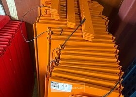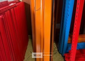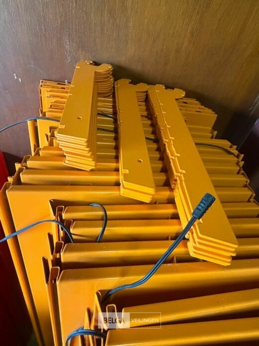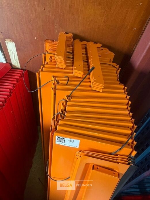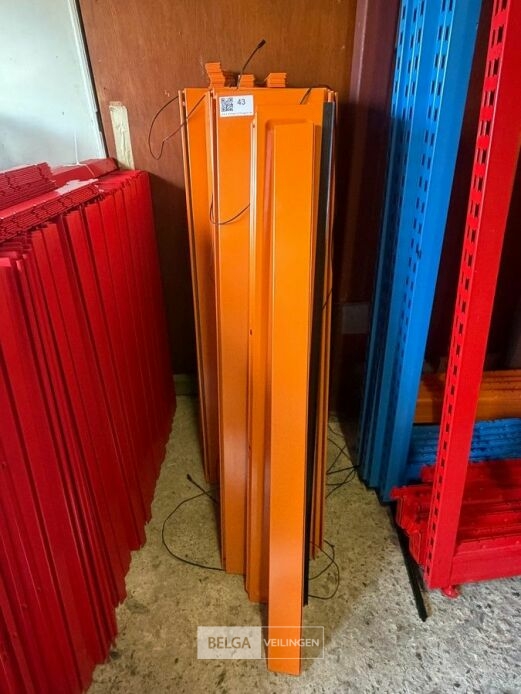 Gondola/winkelrekken modulair, oranje kleur, ± 4 staanders met poten afm. ± 125 x 76 cm, ± 8 achterpanelen afm. ± 125 x 40 cm , ± 4 rugpanelen afm. ± 125 x 30 cm, ± 8 legplanken afm. ± 125 x 37 cm, ± 4 legplanken afm. ± 125 x 30 cm, ± 7 legplanken afm. ± 125 x 25 c(waarvan enkele met led strip zonder controller en zonder voedingsadaptor), ± 16 beugels ± 30 cm , ± 8 beugels ± 35 cm , ± 8 beugels ± 42 cm, omkasting in hout, acryl vakverdelers