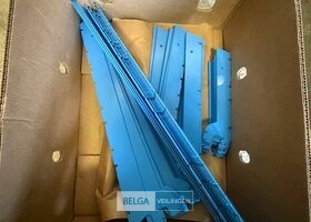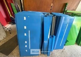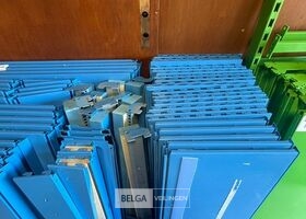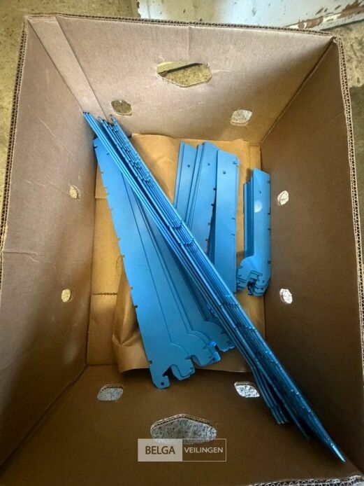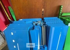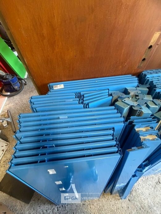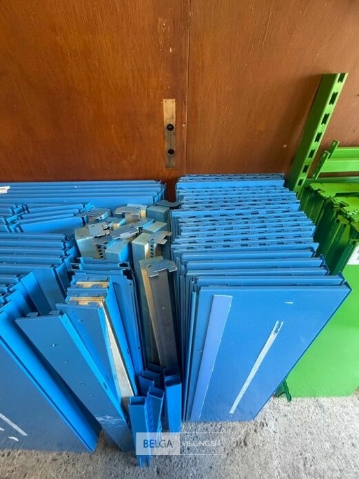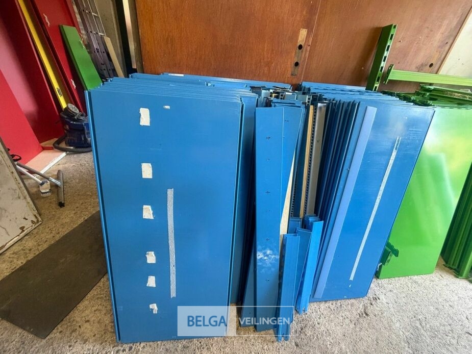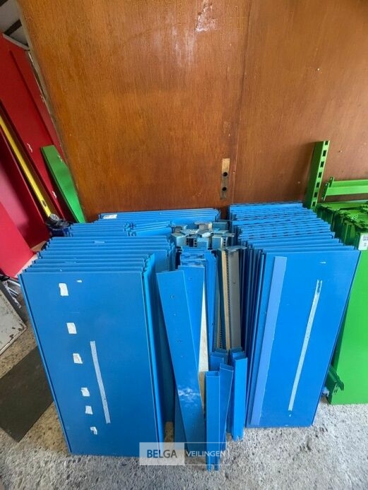 Gondola/winkelrekken modulair, blauwe kleur, ± 6 staanders met poten afm. ± 260 x 70 cm, ± 35 achterpanelen afm. ± 100 x 40 cm , ± 5 legplanken afm. ± 100 x 66 cm, ± 5 legplanken afm. ± 100 x 37 cm, ± 5 legplanken afm. ± 100 x 57 cm, ± 5 legplanken afm. ± 100 x 47 cm, ± 5 legplanken afm. ± 100 x 30 cm , ± 5 legplanken afm. ± 100 x 18 cm, ± 5 afdichtingspanelen met rubber, ± 5 afdichtingspanelen zonder rubber, ± 10 beugels ± 25 cm , ± 10 beugels ± 35 cm , ± 10 beugels ± 42 cm , ± 10 beugels ± 50 cm , ± 10 beugels ± 66 cm, omkasting in hout, acryl vakverdelers en kassameubel