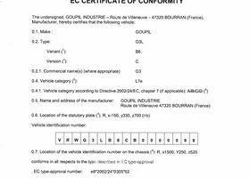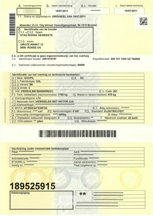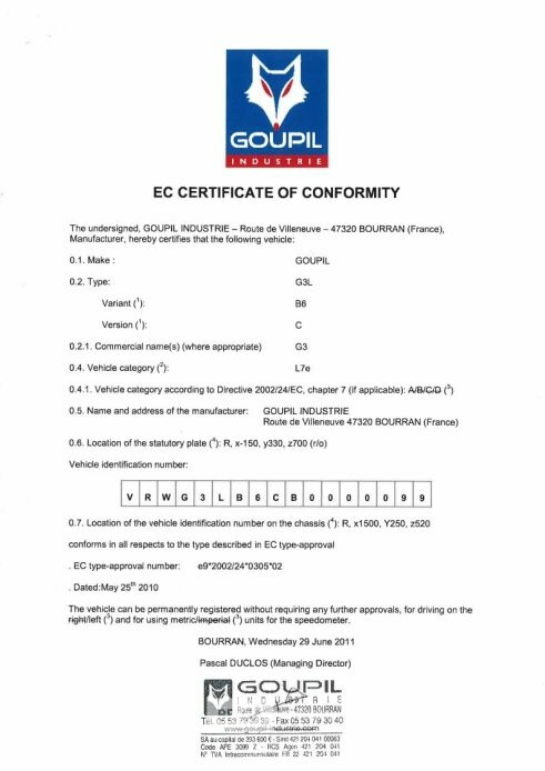 GOUPIL G3L electrisch voertuig, chassisnummer VRWG3LB6CB0000099, voertuigcategorie L7e, bouwjaar 2011, brandstof : elektriciteit, motorvermogen 5kW, sleutels en boorpapieren (kentekenbewijs en gelijkvormigheidsattest) aanwezig, problemen met de batterij