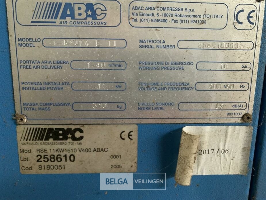 Grote compressor van het merk ABAC, model R MULA E 11, serienummer 2586100001, werkingsdruk 10 bar, 11kW, 400V. Noise lever 69 dB(A). Het aangeboden kavel werd niet onderzocht op gebreken en niet getest op werking. Maak gebruik van het kijkmoment om u te voorzien van de nodige indrukken.