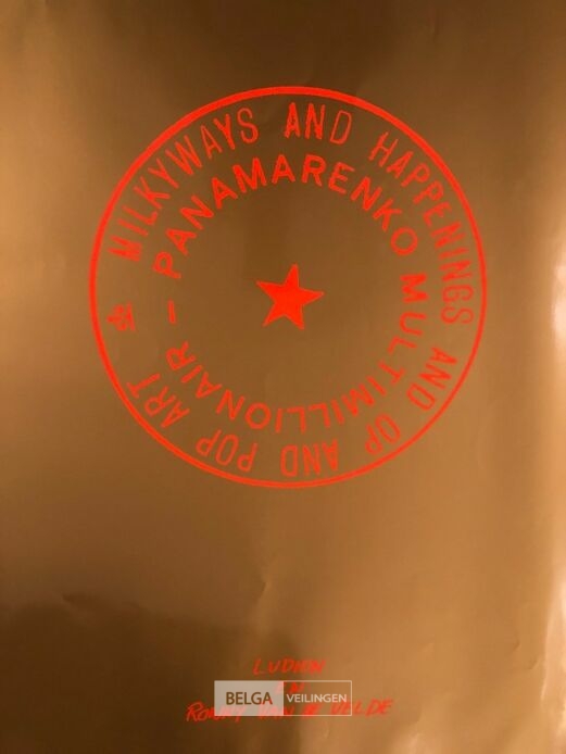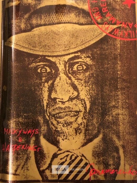 Cover en backcover van de map Milkyways - Gesigneerd in druk, gedrukt op folie - afbeelding Panamarenko met hoofd onder de kopieermachine en met zijn kenmerkende multimiljonair hoed - 98x68 - galerijprijs 200 euro