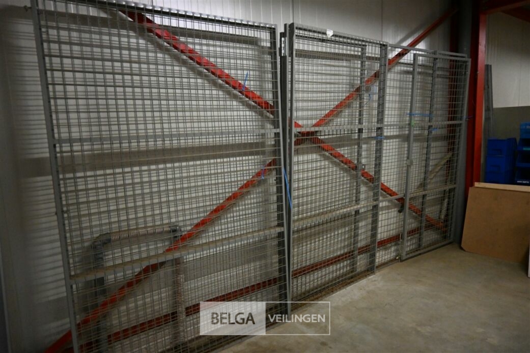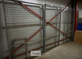 Hekwerk in grijs gelakt metaal, 6x afm 150x225x3 cm, deur van 100x225x3 cm, paneel van 100x225x3 cm, paneel van 60x225x3 cm
