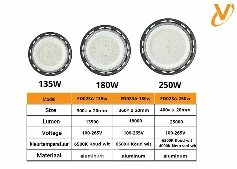 20 x Highbay UFO 135 Watt LED SLIM ontwerp biedt hoge efficiëntie met 13.500 lumen bij 100 lumen per watt - Koud wit licht bij 6500K voor heldere, scherpe verlichting - Waterdicht met IP65-classificatie, ideaal voor zowel binnen- als buitengebruik - Slank, compact ontwerp (Ø 300 x 70mm) voor eenvoudige installatie - Duurzame constructie van aluminium en PC met een levensduur van 30.000 uur - 110° stralingshoek voor brede lichtdekking - Energiezuinig met een power factor >0,95 - Hoge CRI >80 voor nauwkeurige kleurweergave - Compatibel met 110-265V - Wordt geleverd met 2 jaar garantie voor gemoedsrust - Geïntegreerde DOB IC-driver zorgt voor stabiele prestaties - Weinig onderhoud dankzij de lange levensduur - Efficiënte warmteafvoer voorkomt oververhitting - Milieuvriendelijk en kosteneffectief, wat de energierekening verlaagt - Zorgt voor flikkervrije, stabiele verlichting.