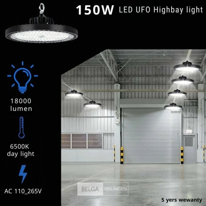 20 x Highbay UFO 150 Watt LED PRO design biedt hoge efficiëntie met 18.000 lumen bij 120 lumen per watt - Uitgerust met Professioneel LED voor superieure helderheid en betrouwbaarheid - Dimbaar met een schakelaar die 3 verschillende standen biedt: 60%/80%/100% vermogen - Aangedreven door een hoogwaardige Lifud-driver, die stabiele prestaties garandeert - Koud wit licht bij 6500K voor heldere, duidelijke verlichting - Waterdicht met een IP65-classificatie, ideaal voor zowel binnen- als buitengebruik - Afmetingen: Ø 310mm x 102mmmm voor eenvoudige installatie - Duurzame constructie van gegoten aluminium met een PC-lens, met een levensduur van 30.000 uur - 90° stralingshoek voor brede lichtdekking - Energiezuinig met een power factor >0,95 - Hoge CRI >80 voor nauwkeurige kleurweergave - Compatibel met 110-265V - Geleverd met 5 jaar garantie voor gemoedsrust - Weinig onderhoud door de lange levensduur - Efficiënte warmteafvoer voorkomt oververhitting - Milieuvriendelijk en kosteneffectief, verlaagt de energiekosten - Biedt flikkervrij, stabiel licht.