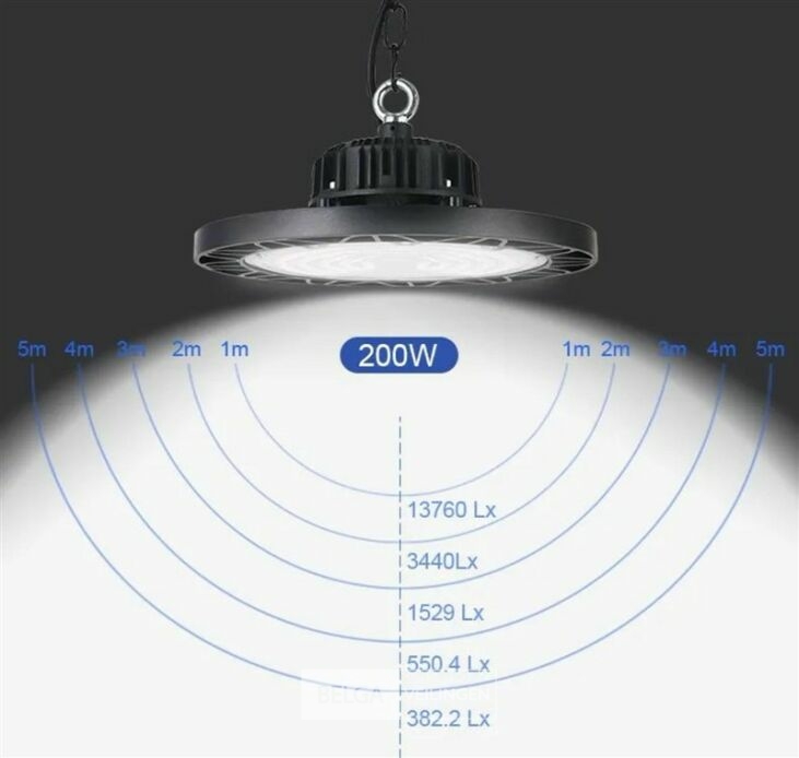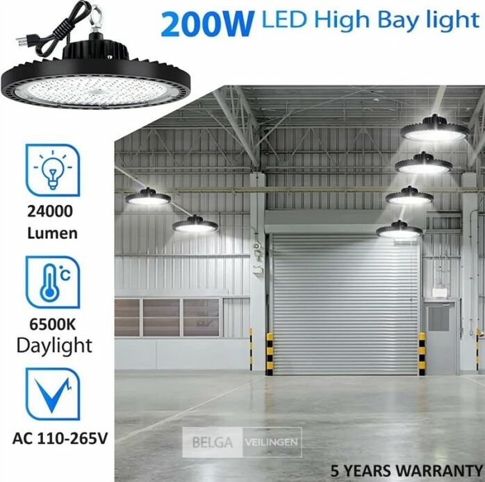 4 x Highbay UFO 200 Watt LED PRO design biedt hoge efficiëntie met 24.000 lumen bij 120 lumen per watt - Uitgerust met Professioneel LED voor superieure helderheid en betrouwbaarheid - Dimbaar met een schakelaar die 3 verschillende standen biedt: 60%/80%/100% vermogen - Aangedreven door een hoogwaardige Lifud-driver, die stabiele prestaties garandeert - Koud wit licht bij 6500K voor heldere, duidelijke verlichting - Waterdicht met een IP65-classificatie, ideaal voor zowel binnen- als buitengebruik - Afmetingen: Ø 350mm x 106mm voor eenvoudige installatie - Duurzame constructie van gegoten aluminium met een PC-lens, met een levensduur van 30.000 uur - 90° stralingshoek voor brede lichtdekking - Energiezuinig met een power factor >0,95 - Hoge CRI >80 voor nauwkeurige kleurweergave - Compatibel met 110-265V - Geleverd met 5 jaar garantie voor gemoedsrust - Weinig onderhoud door de lange levensduur - Efficiënte warmteafvoer voorkomt oververhitting - Milieuvriendelijk en kosteneffectief, verlaagt de energiekosten - Biedt flikkervrij, stabiel licht.