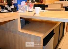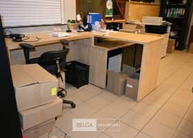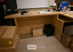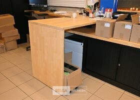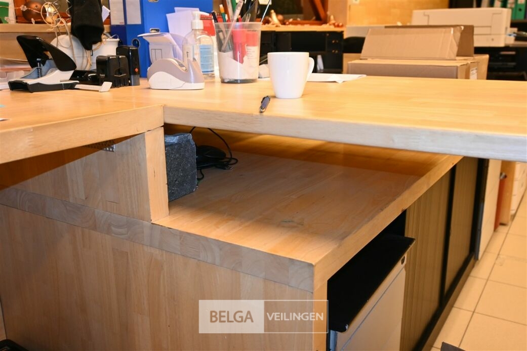 Houten bureau + 2 ladeblokken en dossierkast met roldeuren, totale lengte 410cm, breedte 90 en 150cm, zonder de inhoud op de foto's
