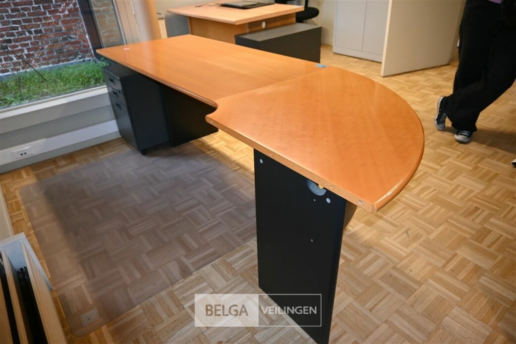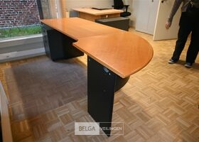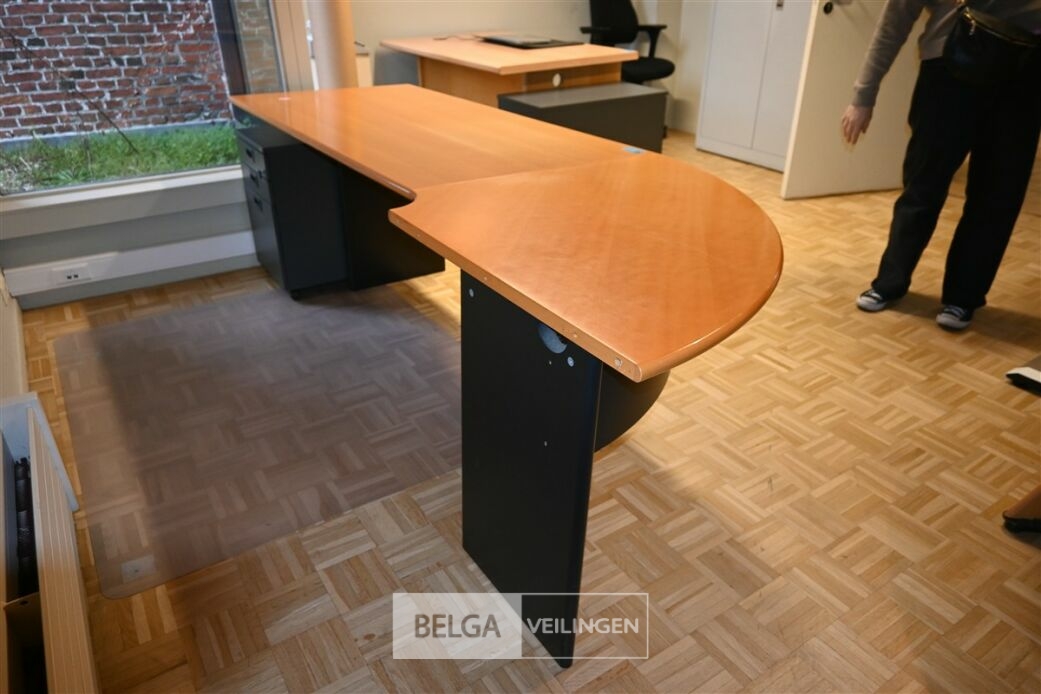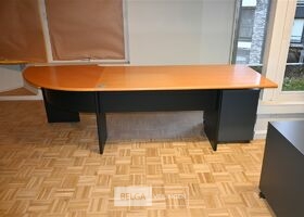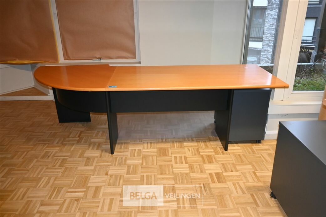 Houten bureau, afm 250x90x74cm + ladeblok. Opgelet! Dit lot bevindt zich op de eerste verdieping en dient door de koper zelf naar beneden te worden gebracht.