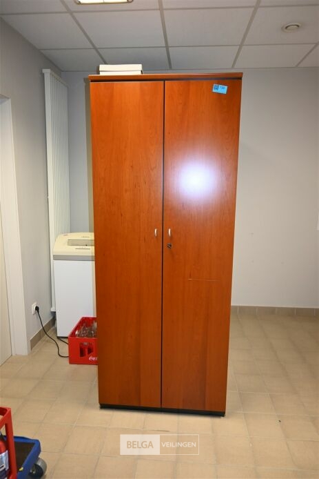 Houten dossierkast, afm 80x54x199cm, zonder de inhoud op de foto's. Opgelet! Dit lot bevindt zich op de eerste verdieping en dient door de koper zelf naar beneden te worden gebracht.
