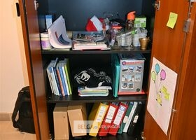 Houten dossierkast, afm 80x54x127cm, zonder de inhoud op de foto's. Opgelet! Dit lot bevindt zich op de eerste verdieping en dient door de koper zelf naar beneden te worden gebracht.