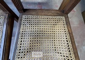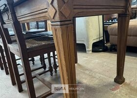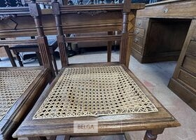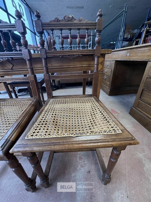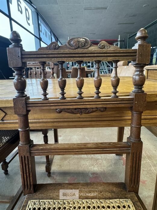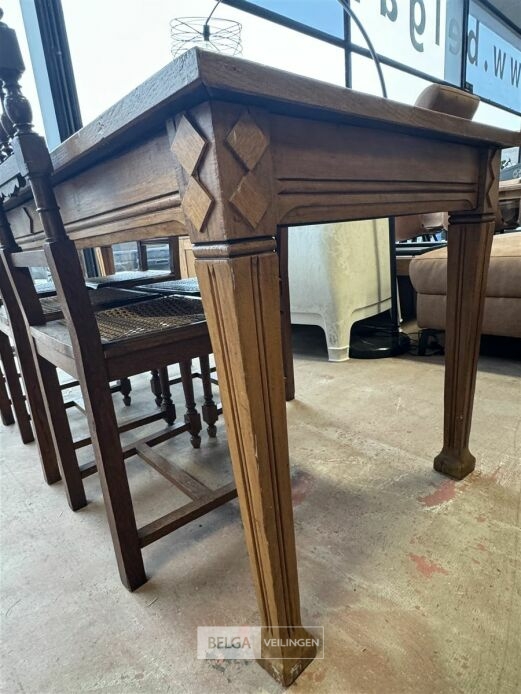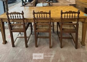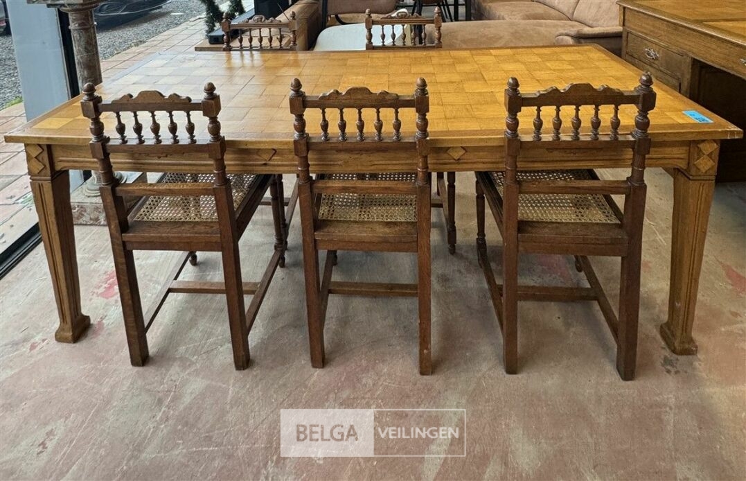 Houten eettafel met 5 rieten stoelen - afm. Tafel ±208 x 77 x 76 cm) – 1 stoel beschadigd aan zitvlak - zithoogte ± 46 cm