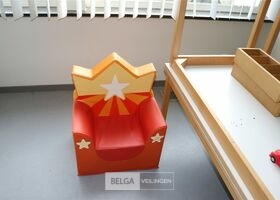 6 houten kinderstoenen H 0,35m x B 0,26m en 4 houten kindertafeltjes H 0,57m x B 0,68m x L 1,35m + 1 kunststof kinderzeteltje