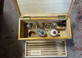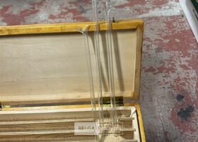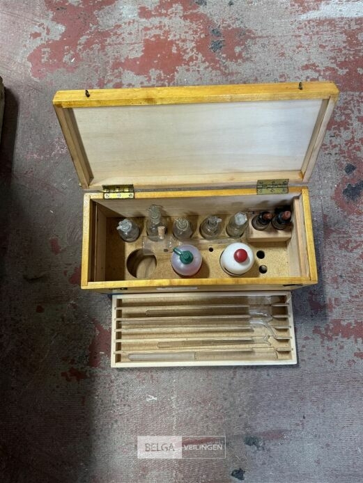Houten kistje met alcoholmeter/hydrometer ( glazen buisjes) – (afm. 38 cm x 16 cm x 17 cm) + vloeistof