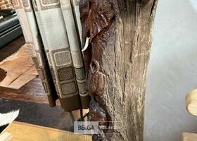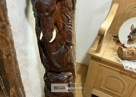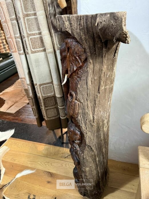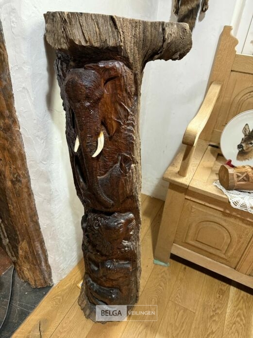Houten stam met uitgesneden figuratie. Afm H. 112 x ø 30cm