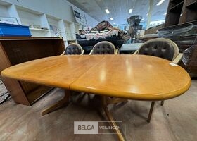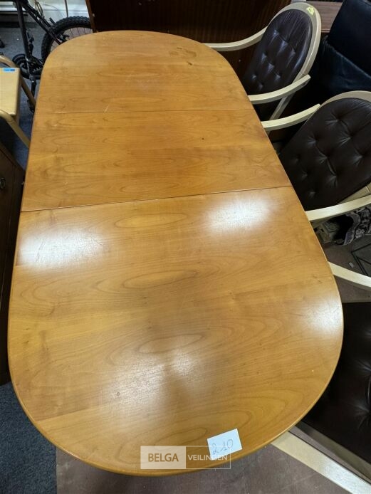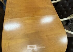 Houten uitschuifbare eettafel met 3 houten stoelen – afm ± 140 cm (100 cm) x 93 cm – zithoogte stoel : 45 cm – lederen stoelbekleding
