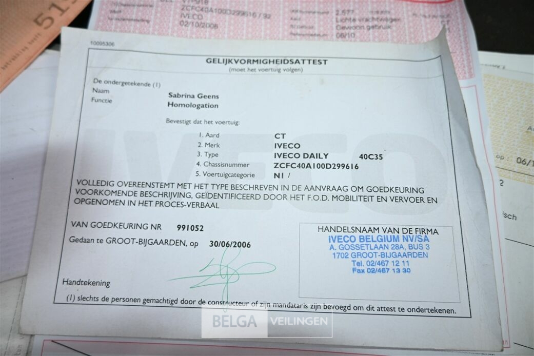 IVECO DAILY lichte vrachtwagen, chassisnummer ZCFC40A100D299616, bouwjaar 2006, 176.870km volgens laatste keuringsverslag, diesel, euro 3, motorinhoud 2998cm3, motorvermogen 100kW, trekhaak, handgeschakeld, sleutel en boordpapieren (inschrijvingsbewijs, gelijkvormigheidsattest, keuringsverslag en identificatieverslag) aanwezig, dit voertuig heeft mogelijk een platte batterij, de koper dient zelf te voorzien in middelen om te starten
