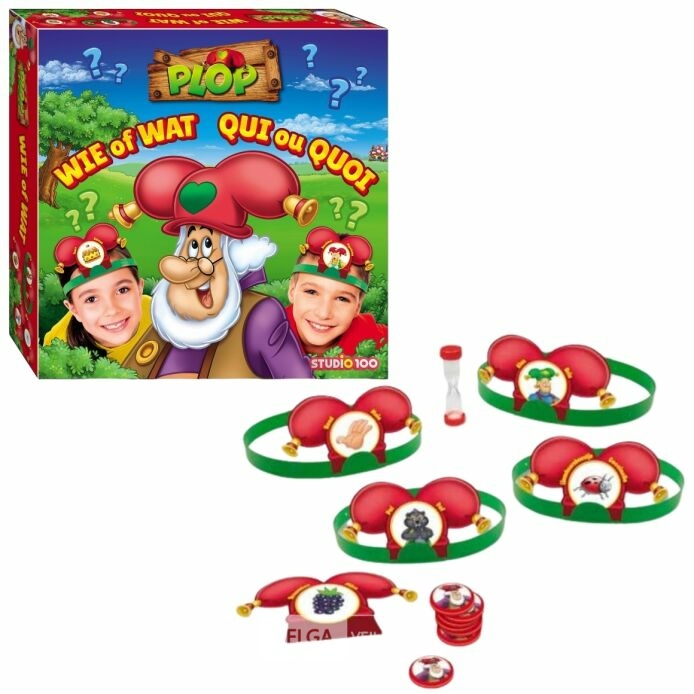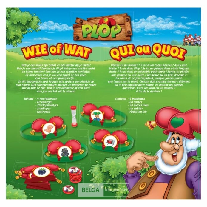 4 hoofdbanden, 60 kaartjes, 28 plopmuntjes, zandloper en spelregels.Geschikt voor 2 tot 4 spelers vanaf 4 jaar.