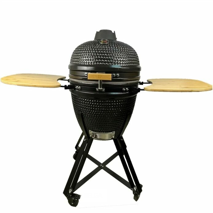Kamado grill + Trolly (18 inch - ± 45cm) Ø hoofdgedeelte: 44,5cm, Ø grillrooster: 38,3 cm, Product afm: 103,5 x 59 x 105 cm, Gewicht van het artikel: 75 kg, Kleur: Zwart