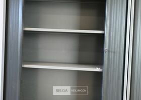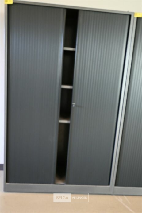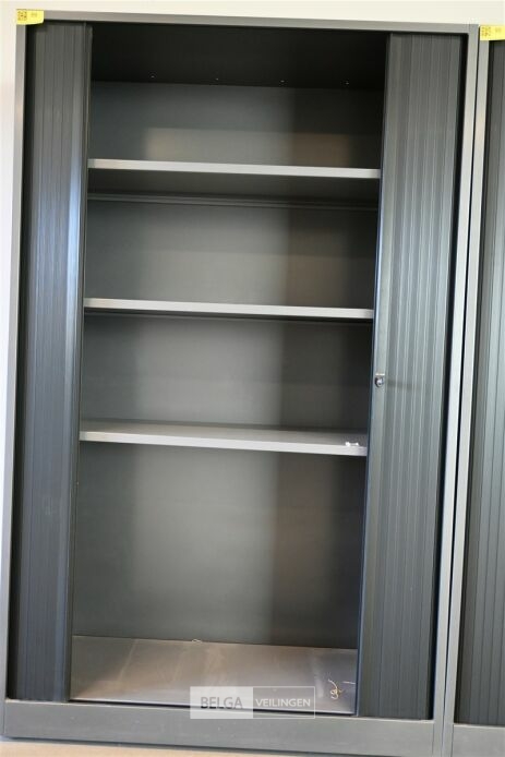 Kast metaal grijs, grijze roldeuren, 100 cm x 48 cm x 198 cm, 3 leggers.