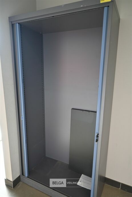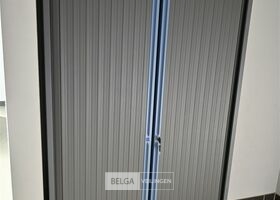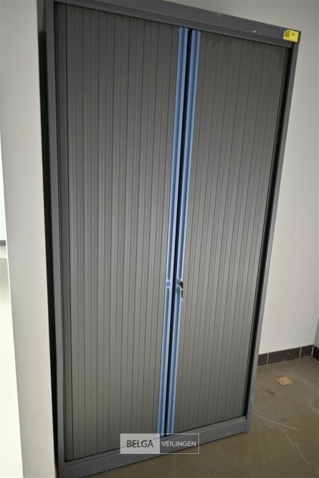 Kast metaal grijs, grijze roldeuren, 100 cm x 48 cm x 198 cm.