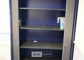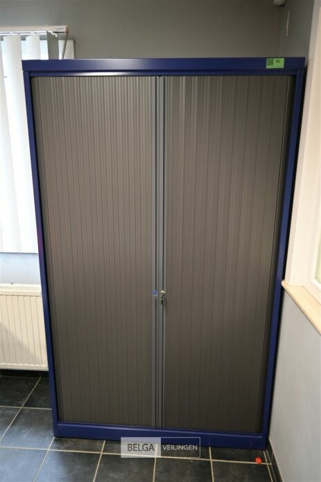 Kast, blauw met donkergrijze roldeuren / 4 leggers, afm 120 x 48 x 198 cm (zonder inhoud)