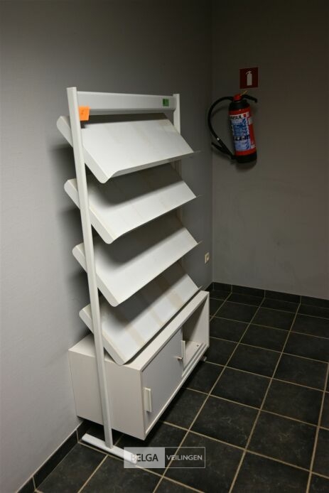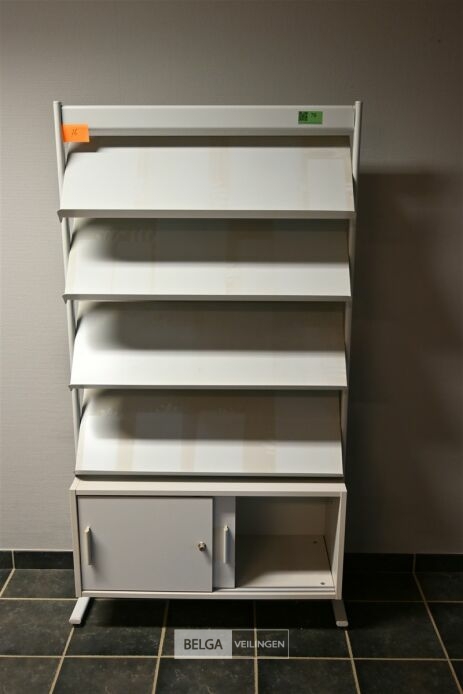 Kast folderdisplay, lichtgrijs 89x40x167 cm, 4 metalen displays en houten kastje h= 38 cm